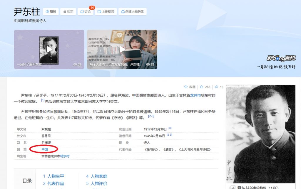 2年前には、中国共産党機関紙・人民日報系「環球時報」が、ユン・ドンジュを「日本帝国主義に抵抗して独立運動に参加した『(中国少数民族の一つである)朝鮮族の愛国詩人』」と紹介し、物議を醸したことがある。