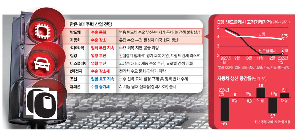 韓国銀行が今年、半導体、自動車、鉄鋼など韓国の主力産業が軒並み低迷に陥るだろうと見込んだ。 「トランプ関税爆弾」が本格化する場合、主力産業輸出には直撃弾になるものと見られる。 連日業種を問わず関税賦課を予告しているドナルド·トランプ米大統領が自動車·半導体·医薬品に25%関税賦課方針を明らかにし、直ちに輸出額が65億ドル(約9兆ウォン)減るという見通しも出ている。 政府は、米国が相互関税の根拠とする非関税障壁から見直す方針だ。