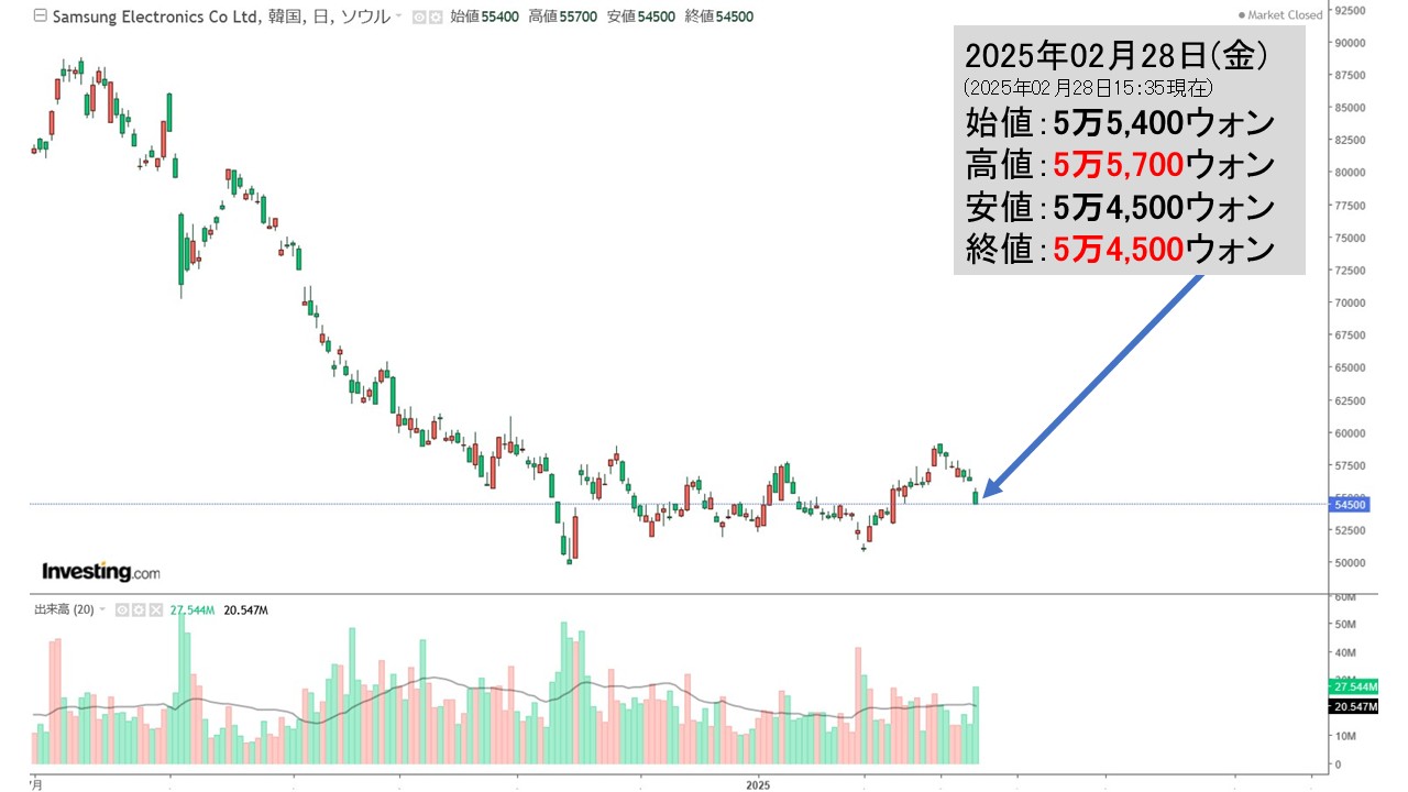 上掲のとおり、2025年02月28日(金)時点で『サムスン電子』の株価は「5万4,500ウォン」。