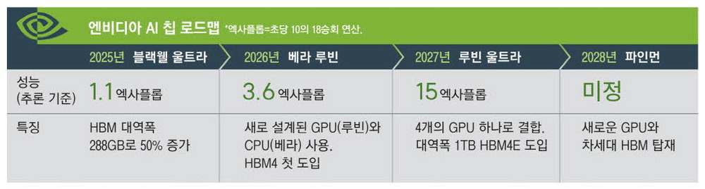 NVIDIAはまた、後続GPUとして来年下半期に披露するベラ·ルービンが、今年下半期に公開されるブラックウェルウルトラ性能の3.3倍に達し、HBM4が初めて搭載されると紹介した。 2027年に披露するルービンウルトラには、1テラバイト帯域幅のHBM4Eが搭載されると明らかにした。