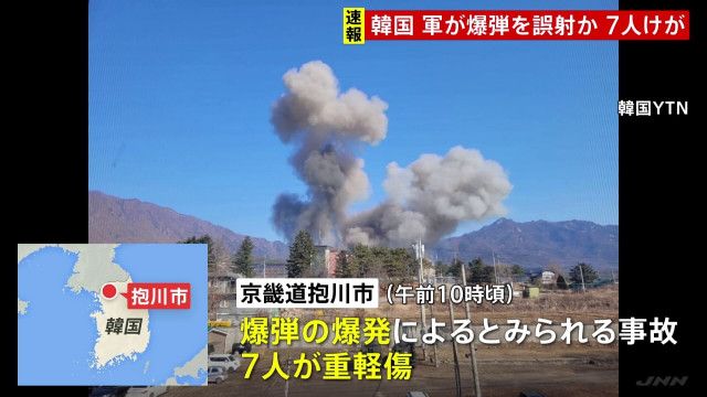 韓国メディアによりますと、6日午前10時過ぎ、ソウル近郊の抱川市で上空を飛行中の韓国軍の戦闘機から砲弾が民家などに落下し、これまでに2人が重傷、5人が軽傷を負いました。
