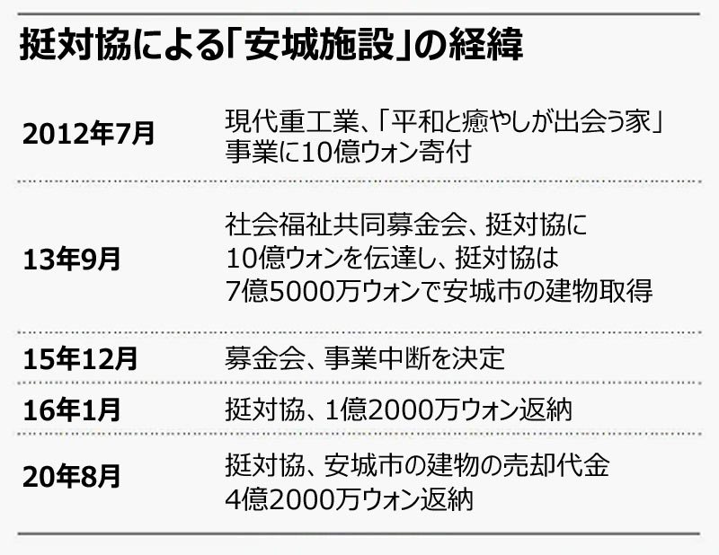 尹美香氏が市民団体「韓国挺身(ていしん)隊問題対策協議会(挺対協)」=現:日本軍性奴隷制問題解決のための正義記憶連帯(正義連)=代表を務めていた時期に寄付金を横領したという疑惑は、2020年5月に慰安婦被害者の李容洙(イ・ヨンス)さんが初めて提起した。検察は同年9月、尹美香氏を業務上横領や詐欺など八つの罪で起訴した。大法院は昨年11月、挺対協の寄付金8000万ウォン(現在のレートで約830万円、以下同じ)の横領や、女性家族部(省に相当)の補助金6520万ウォン(約634万円)を違法に受け取ったとして有罪と認め、懲役1年6カ月(執行猶予3年)の有罪判決が確定した。裁判が行われている間に尹美香氏は国会議員の任期4年を全うした。