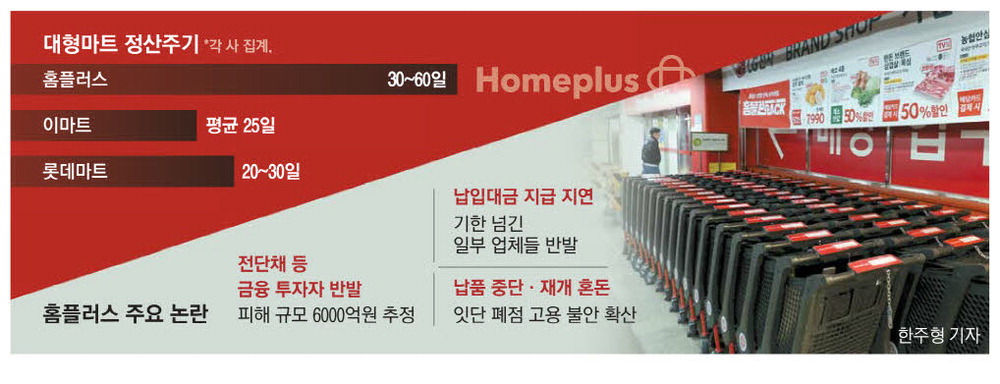 11日、流通業界によれば「ホームプル事態」で代金支給が延ばされ、全国納品会社·入店会社から不満が溢れ出ている。 1月に精算金を支給すると言っていた日に法廷管理を申請したために精算金支給が延ばされる事例が続出したためだ。 ホームプラス納品代金精算周期は30~60日で、他の大型マートより2倍ほど長い。