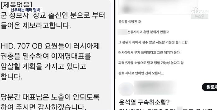 「情報司令部元将校からの情報提供」として「情報司令部特任隊を意味するHIDと特殊戦司令部707特任隊を除隊した(OBの)複数の人物がロシア製の拳銃を密輸入し、李在明代表を暗殺 する計画があるので、当分は表に出ないようにせよ」という内容です。