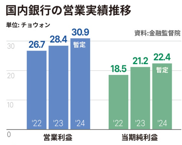 14日、金融監督院は「2024年国内銀行営業実績」を発表し、昨年国内銀行当期純利益が22兆4000億ウォンで前年と比較して5.5%増加したと明らかにした。 株価連携証券(ELS)の賠償費用1兆4000億ウォンをはじめ、営業外損失が拡大したが、貸倒費用が3兆1000億ウォン減少した影響で純利益は増えた。
