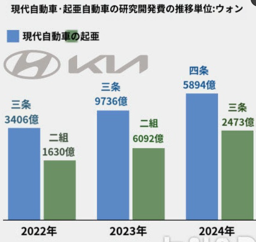 現実には、今まで、どれだけ多額の資金を投入しても無意味だったヒュンダイとキアという韓国の自動車組み立て企業のR&D分野に対して、合算しても僅か8兆韓国ウォンという少額を投入したところで、それが過去の投入額より多くても、成果は何も期待出来ないままだ。>>66