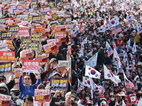 韓国の尹錫悦(ユン・ソクヨル)大統領の弾劾を巡り、ソウル都心で15日、大規模な集会が開かれた。尹大統領の弾劾に賛成する集会(左)には警察推計で計4万2500人が、弾劾に反対する集会には計4万3000人が参加した=(聯合ニュース)弾劾賛成派にも反対派にもデモが判決に影響を与えると考える非法治精神の持ち主がこれだけいるってことだな