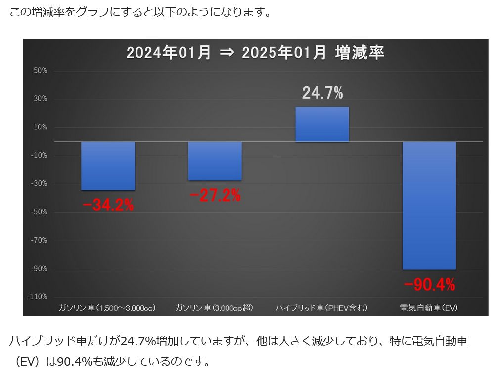 内訳では、(EVが売れない反動で)ハイブリッドは25%ほど増えているけど、ガソリン車は30%程度、EVに至っては90%も減ってる。