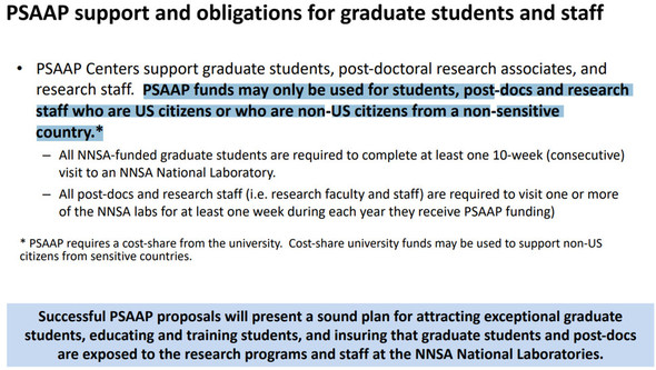 公告文には、プログラムの資金は「米国市民またはセンシティブ国に該当しない国の非米国市民にのみ支援可能」と書かれている。韓国国籍の研究者は米政府からプログラム予算を直接受けることができないという意味だ。プログラム参加者はNNSA傘下の国立研究所でインターンシップや共同研究を行うことが義務付けられているが、公告文には「非米国市民、特にセンシティブ国出身者の場合、NNSA傘下の研究所でインターンシップ、訪問、コンピューティングへの接近を提供することがさらに難しい。行政処理のためにさらに長い事前準備期間が必要だ」と指摘している。センシティブ国の研究者には、研究の機会や協力そのものが制約される可能性があるという意味とみられる。