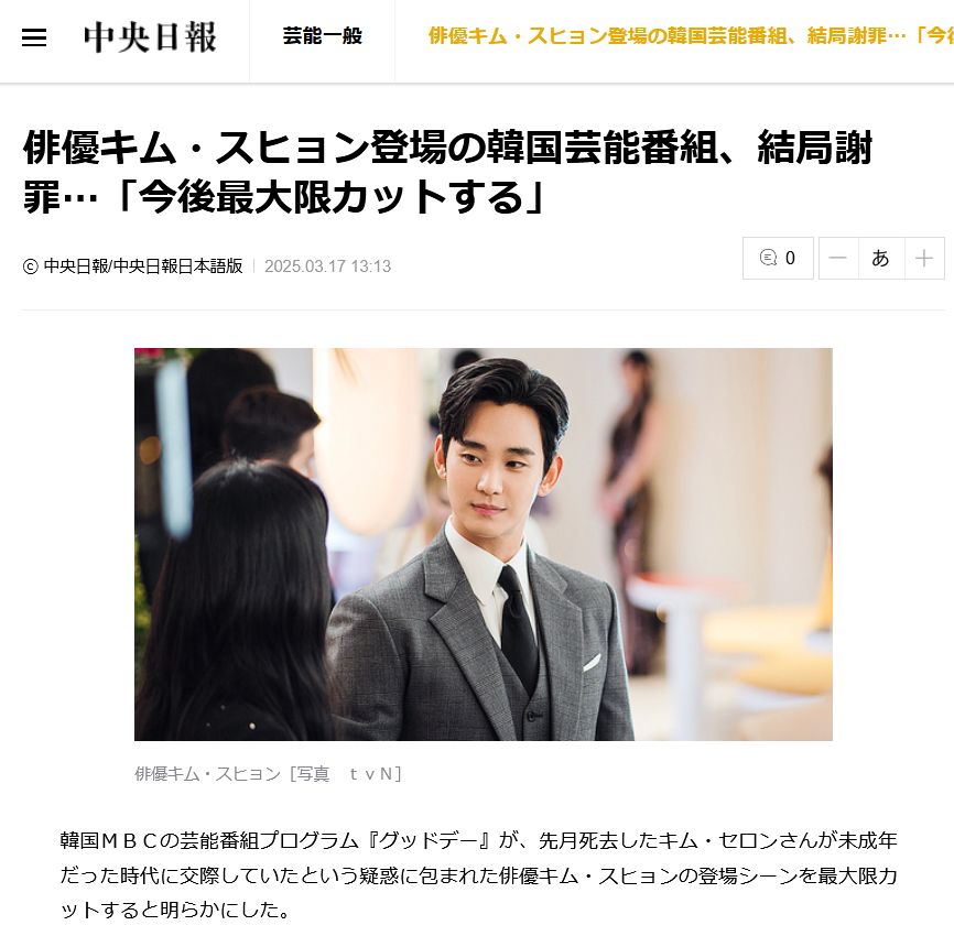 キム・スヒョンが出演したMBCバラエティ番組『グッドデー』は23日放送予定だった第6話の放送休止を発表した。視聴者掲示板などを通じた世論の圧迫が続いたことにともなう決定とみられる。これに先立って『グッドデー』の制作会社「テオ(TEO)」は17日ユーチューブチャンネルなどに上げた立場文で「次回でもキム・スヒョンの出演分を編集する」と明らかにした。「朝鮮人と関わると朝鮮人の家族がついてくる。」