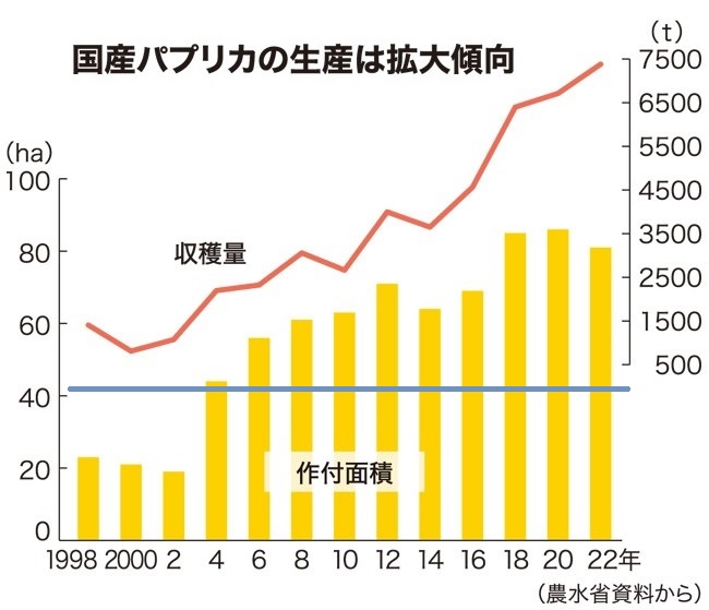一方、国産パプリカの生産量は、増え続けている。2000年度から比べると、10倍近い。