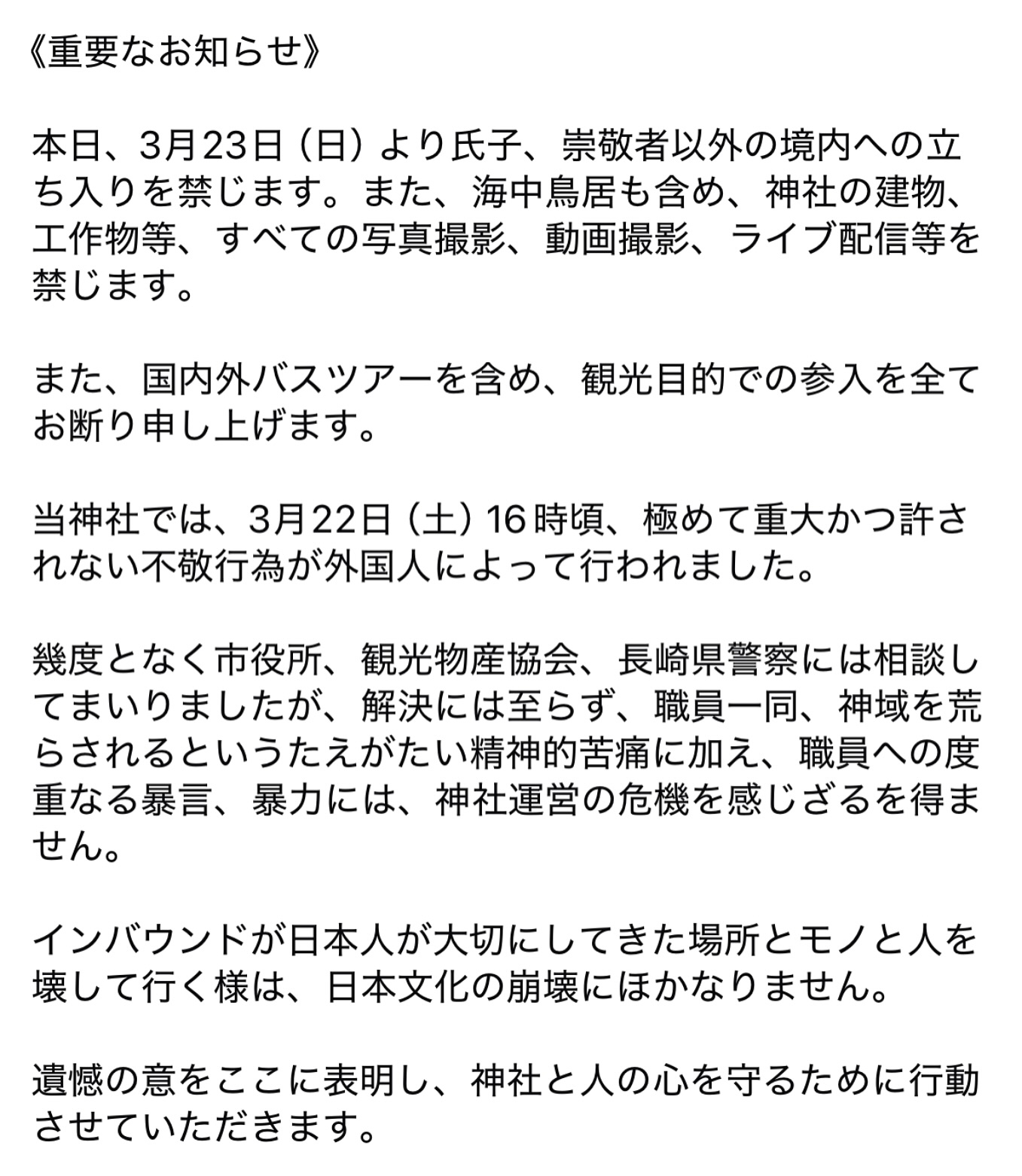 「本日、3月23日(日)より氏子、崇敬者以外の境内への立ち入りを禁じます。また、海中鳥居も含め、神社の建物、工作物等、すべての写真撮影、動画撮影、ライブ配信等を禁じます」