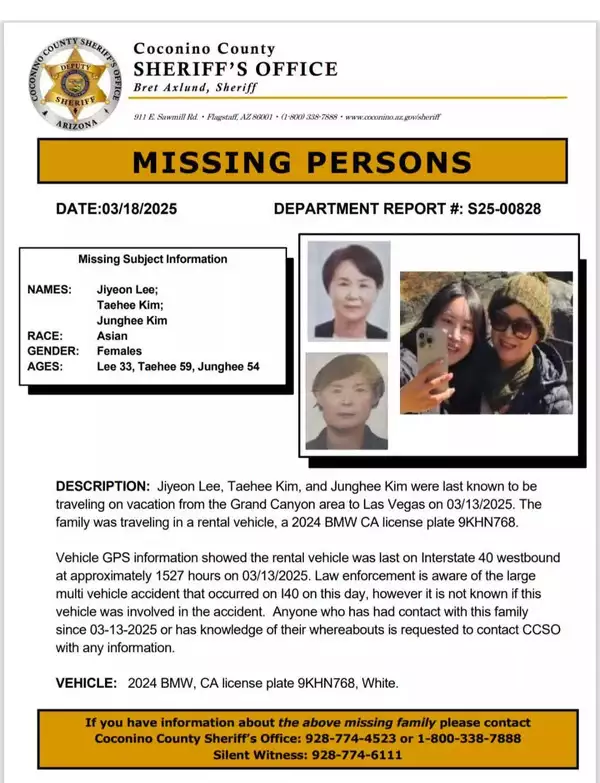 米国グランドキャニオンを訪問した一家女性3人が突然行方不明になった中で、彼らが搭乗していた車両と同じ機種の車両が高速道路交通事故現場で発見された。