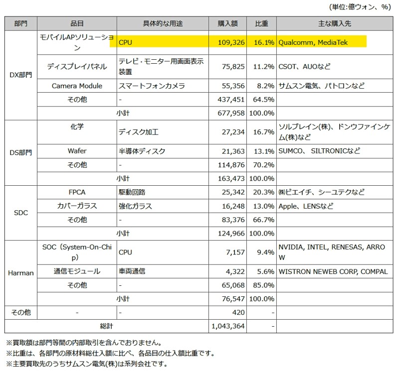 『Qualcomm(クアルコム)』などからモバイルAP(アプリケーションプロセッサー)を10兆9,326億ウォンも購入しています。