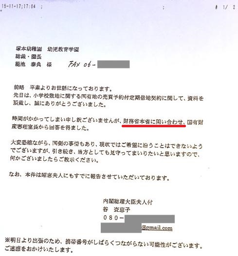 証人喚問後に公開されたFAX(内閣総理大臣夫人 付 政府職員谷査恵子Saeko Tani氏から→森友学園に送られた内容)