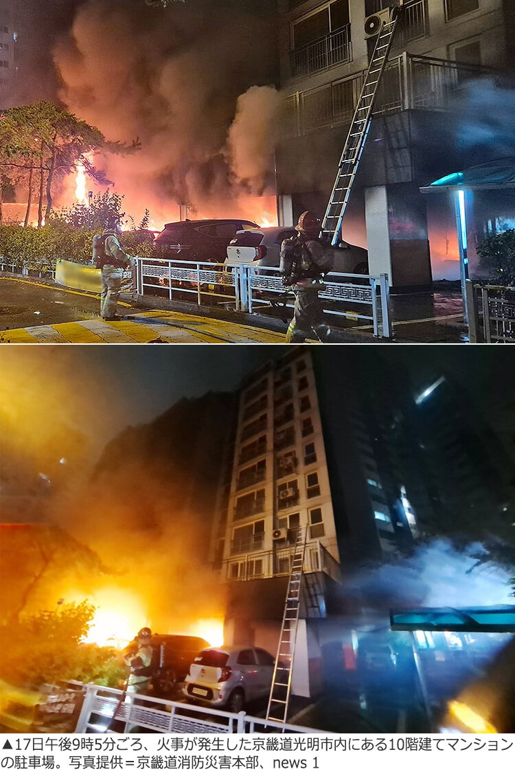 京畿道光明市のマンション駐車場で大きな火事が発生し、 住民3人が心肺停止状態で発見された。