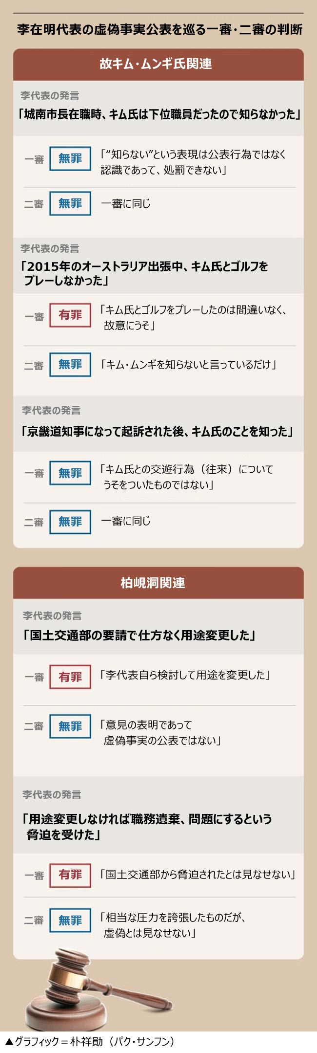 先に一審は、李代表が故キム・ムンギ氏の死亡直後に「キム氏とゴルフをプレーしたことはない」と発言したこと、国政監査で柏峴洞の開発優遇疑惑について「国土交通部(省に相当)の脅迫で用途変更をした」と発言したことを有罪と認め、懲役1年・執行猶予2年を言い渡した。しかし控訴審は、この二つの発言にもそろって無罪を言い渡した。