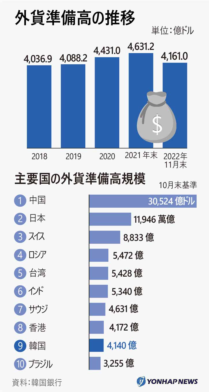 韓国の外貨準備高の規模は、1月末時点(4110億ドル)で世界9位となっている。中国が3兆2090億ドルで最も多く、日本(1兆2406億ドル)、スイス(9173億ドル)、インド(6306億ドル)、ロシア(6208億ドル)、台湾(5776億ドル)、サウジアラビア(4343億ドル)、香港(4215億ドル)の順だ。>>1
