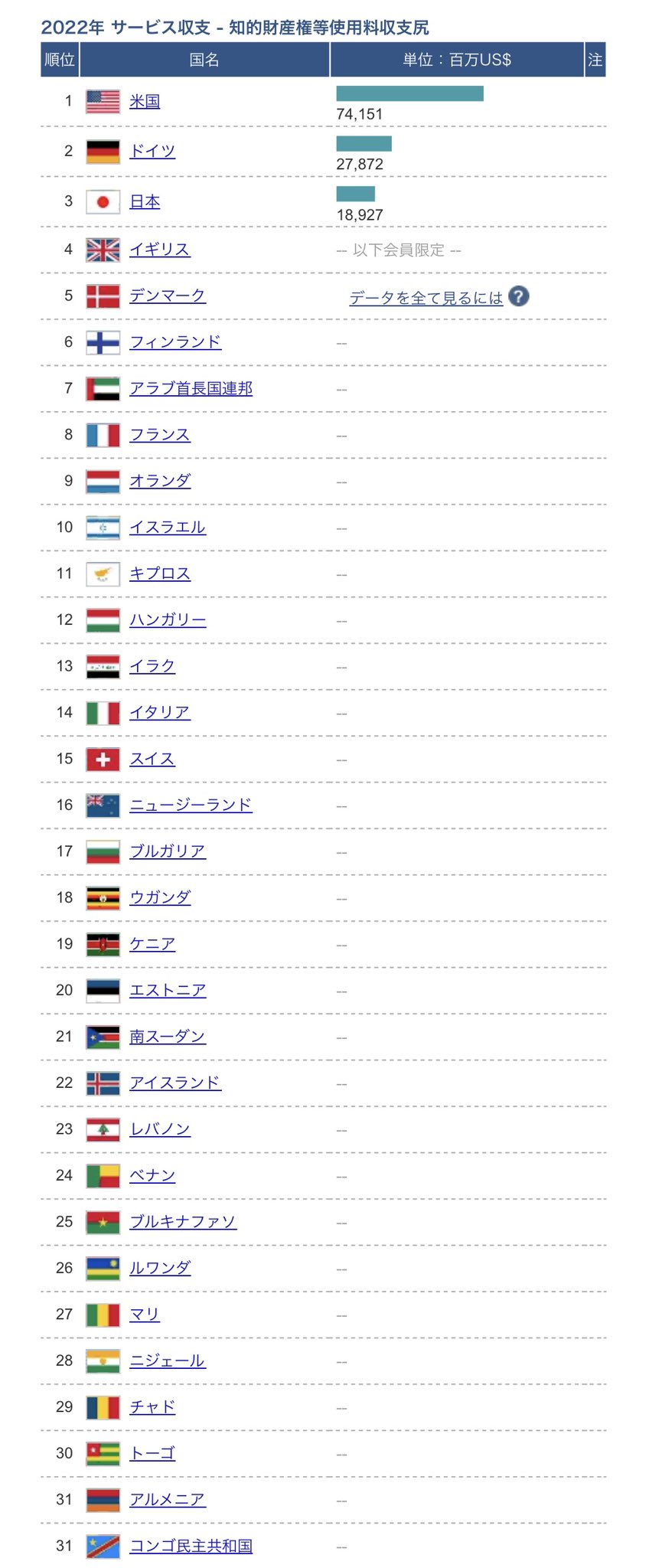 ときどき韓国から「K-POPや映画などで知的財産権の使用料として黒字になりました」などの報道が出ることがありますが、それは限定した範囲内での話であって、国際収支統計で見るとこうなります。