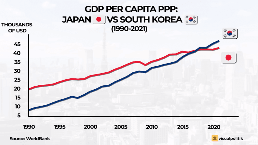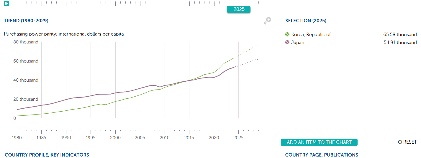 1人当たりGNIは2014年に3万798ドルで初めて3万ドルを達成した後も着実に増え、2021年には3万7898ドルでピークに達した。2022年の急激なウォン切り下げで3万5000ドル台に落ち込んだ。その後2年連続で反騰したが、依然として3万6000ドル台にとどまっている。