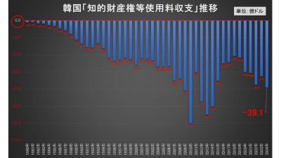 1980~2024年の金額推移ですが、韓国は1年たりとも黒字にったことはありません。数字は全部「0」の下にあります。直近の2024年は「-39.1億ドル」。韓国は、知的財産権において支払ってもらう金額より、外国に支払う金額の方が多いのです。
