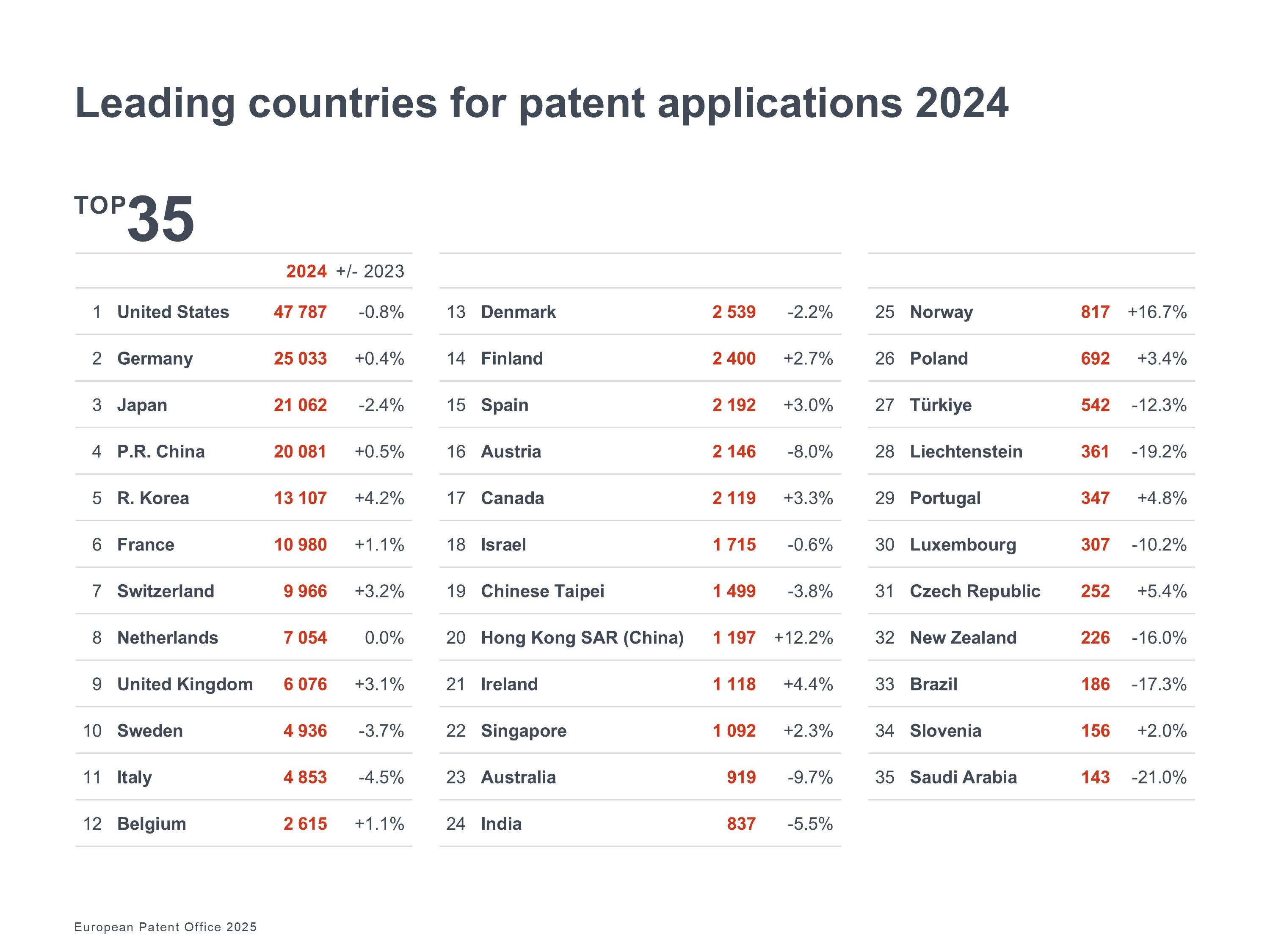 39のEPO加盟国からの特許出願は+0.3%増加し、スイス(+3.2%)と英国(+3.1%)からの成長に後押しされ、EU27加盟国からの出願は-0.4%減少しました。ヨーロッパの上位2つの申請国であるドイツ(+0.4%)とフランス(+1.1%)は、2024年にわずかに増加しました。スイスは一人当たりの特許で引き続きトップ国であり、北欧諸国がそれに続きます朝鮮人〇〇ってバカ朝鮮人そのものだよな。