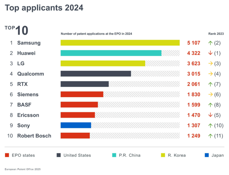 EPOの特許出願件数上位25社に日本企業4社がランクインした。ソニーグループが1,307件の出願でトップとなり、2023年の10位から順位を上げ、9位を獲得。以下、パナソニックが990件、キヤノンが760件、日立が653件と続く。>>6>>7