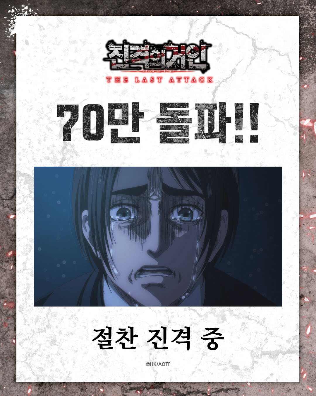 今度は『進撃の巨人』か。映画として公開された『劇場版 進撃の巨人 完結編 The Final Attack』(以下『進撃の巨人』)が、韓国で観客動員数50万人を突破した。2023年の『THE FIRST SLAM DUNK』シンドロームと、近年のJ-POPブームの流れに乗り、日韓間のコンテンツ協業も増えている今、Jコンテンツの「進撃」は何を物語っているのだろうか。
