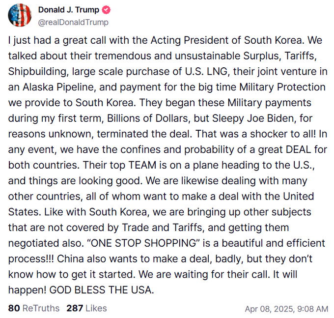 방금 한국의 대통령 대행과 훌륭한 통화를 했습니다. 우리는 그들의 엄청난 무역 흑자와 관세, 조선, 대규모 미국 LNG 구매, 알래스카 파이프라인 공동 사업, 그리고 우리가 한국에 제공하는 대규모 군사 보호에 대한 비용 지불에 대해 이야기했습니다. 첫 임기 동안 수십억 달러를 지불했지만, 졸린 조 바이든은 이유를 알 수 없게도 이를 종료했습니다. 정말 충격적이었습니다! 어쨌든, 우리는 양국 모두에게 훌륭한 거래를 성사시킬 수 있는 확신과 가능성을 가지고 있습니다. 그들의 최고 팀이 미국으로 향하는 비행기에 있으며, 상황이 좋아 보입니다. 우리는 미국과 거래를 원하는 많은 다른 나라들과도 협상 중입니다. 한국과 마찬가지로, 우리는 무역과 관세로 다루지 않는 다른 주제들을 제기하고 협상하고 있습니다. "원스톱 쇼핑"은 아름답고 효율적인 과정입니다!!!