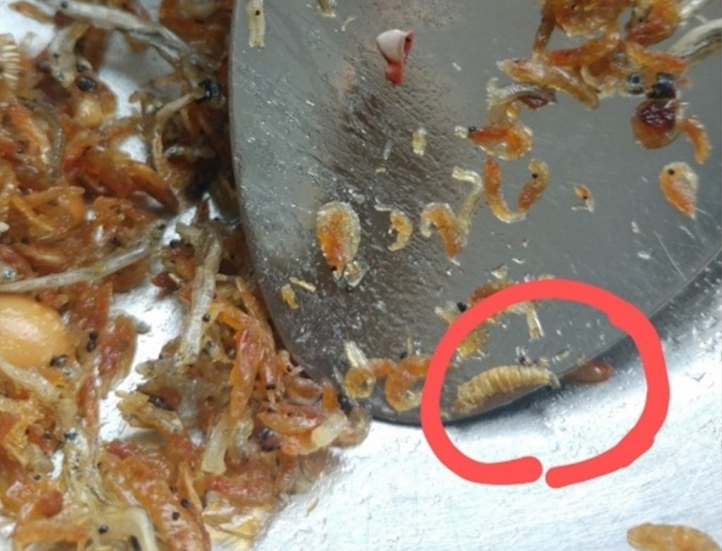 その後、このカタクチイワシを炒めた料理を食べたところ、多数のウジの死体が入っているのがわかったという。A氏が公開した写真には、1センチの長さのウジの死体数匹がカタクチイワシと混ざっていた。
