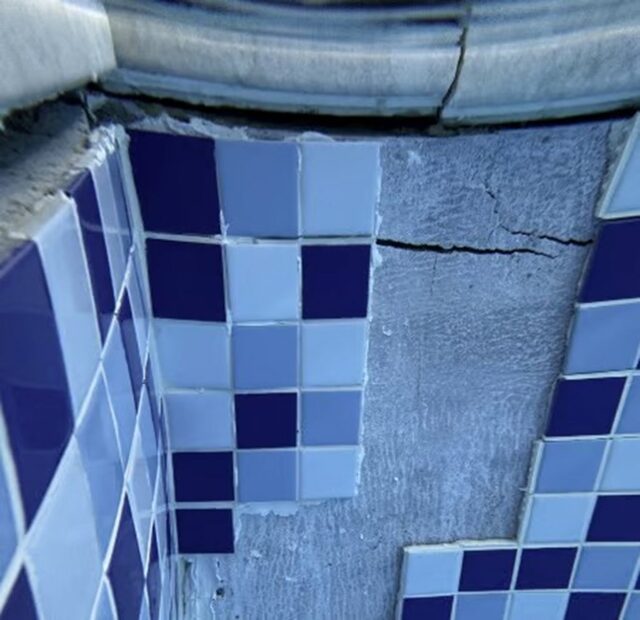 公開された写真には、破損して落ちたタイルの破片がプールの床に放置されている様子や、タイルが剥がれた壁にひびが入っている様子がはっきりと映っていた。また、壁のタイルが剥がれていなくても、内部が膨れ上がりデコボコした状態になっている部分も確認できた。