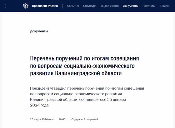 Перечень поручений по итогам совещания по вопросам социально-экономического развития Калининградской области • Президент России