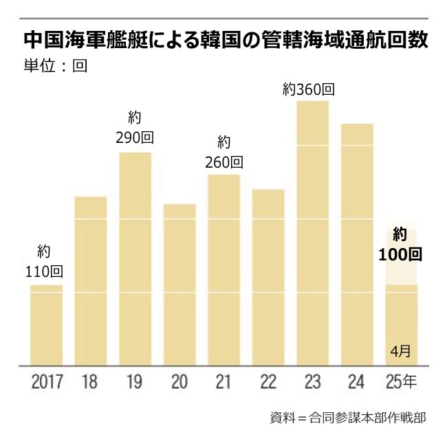 本紙が国民の力の厳泰永議員事務所を通じて入手した韓国軍合同参謀本部の資料によると、中国軍艦艇による韓国管轄海域の通過回数は昨年だけで330回以上、今年も4月中旬の時点で100回以上を数えるという。管轄海域とは沿岸国が主権あるいは排他的管轄権を行使する海域で、具体的には領海や排他的経済水域(EEZ)などを意味する。国際法上は公海だが、外国軍艦艇が通過すれば海軍の監視を受けることになる。