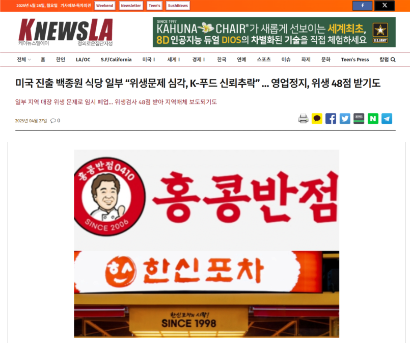 アメリカ進出のペク・ジョンウォンの一部の飲食店、『衛生問題が深刻、K-フードの信頼失墜