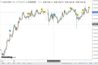 最近のウォン安は、米連邦政府のシャットダウン(政府閉鎖)長期化と米中貿易戦争再燃に対する懸念から安全資産を好む心理が広がった影響とみられる。特に中国がレアアース(希土類)輸出の統制を強化したのに対し、ドナルド・トランプ米大統領が10日、「11月1日から中国製品に対して追加で100%の関税を課す」と表明し、報復に出たことが市場不安を高めた。貿易葛藤による不確実性が続く中で、リスク資産に分類されるウォンへの下押し圧力が強まった格好だ。さらに、最近の円安傾向や膠着状態に陥った韓米関税交渉も重なり、ウォン価値は主要国通貨の中でも特に著しい下落を見せている。