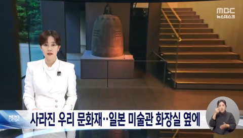 日本に奪われた済州の鐘が日本の美術館内のトイレの脇に設置される