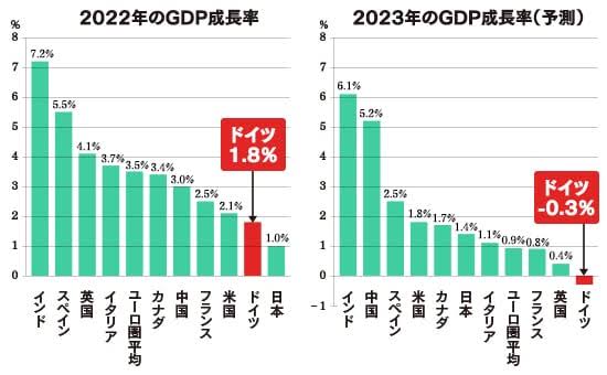ドイツの実質GDP成長率は2023年マイナス0.3%、昨年もマイナス0.2%。1950年以来初の3年連続景気後退に陥る恐れすらある。今年の失業率は昨年の6%から0.3ポイント上昇するものの、インフレ率は2.2%から2.0%に、来年は1.9%に鈍化する見通しだ。