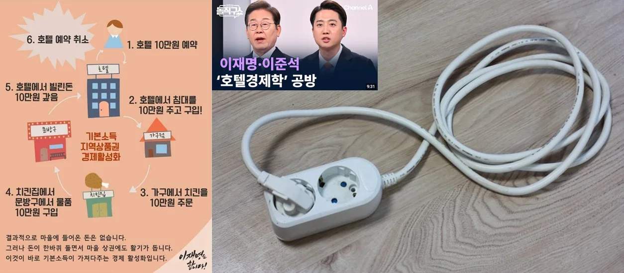 韓国最大野党・共に民主党の李在明(イ・ジェミョン)大統領選候補が16日の選挙演説で、「経済とはお金が回ること」と言い、持論の「ホテル経済論」を再び持ち出した。観光客がホテルを予約し、予約金10万ウォン(約1万円)を払えば、ホテルのオーナーがこのお金で食品店のツケを返し、食品店主が鶏の丸焼きを買って食べ、鶏の丸焼き店主が靴のツケを返し、靴店主がパンを買って食べる…という具合に回り回って、ホテルに10万ウォンが戻ってくるというもので、「旅行客がホテルの予約をキャンセルし、10万ウォンを返金しても、お金は回る。これが経済だ」と言った。