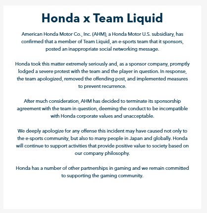 原因は、米ホンダとLiquidとの「企業価値観の相違」にあるとホンダ側は説明している。Team Liquidに所属する選手が、日本・広島への原爆投下を軽視するような行為をしたことが、一連の出来事の背景にある。