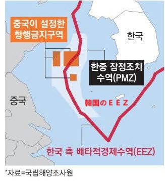 PMZは韓中のEEZが重なるところで境界線を確定していない水域だ。境界が最終画定されていないPMZでは、漁業と関係がない施設の設置や資源の開発など一方的な現状変更行為を自制しなければならない。しかし中国が「サケ養殖施設」と主張する鉄製構造物1・2基と「管理補助施設」名目の構造物など正体不明の構造物をPMZに相次いで設置し、外交関係者から批判が出ている。一部の構造物は石油ボーリング用構造物と似た形態だ。中国にはシェイシェイと言っておけばいいんじゃない?