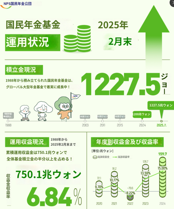 日本は好景気の回復中、公的年金 246兆円(2024/3 実績)、韓国の2倍程度。15年も運用すれば2倍は堅いところだが、まあ環境次第だ。そう言えば、状況悪化に備えて年金法の改正(見直し予定を決めただけだが)をしてたな。