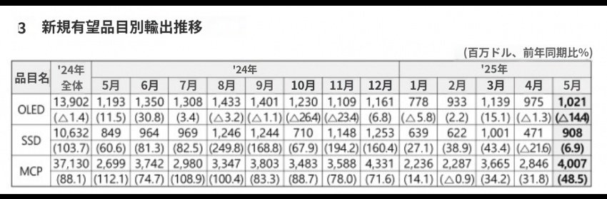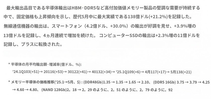 最大の輸出品目である半導体は5月としては過去最高の138億ドルを記録し、前年同月比21.2%増加した。需要増や固定価格上昇の流れなどを追い風に3か月連続の増加となった。
