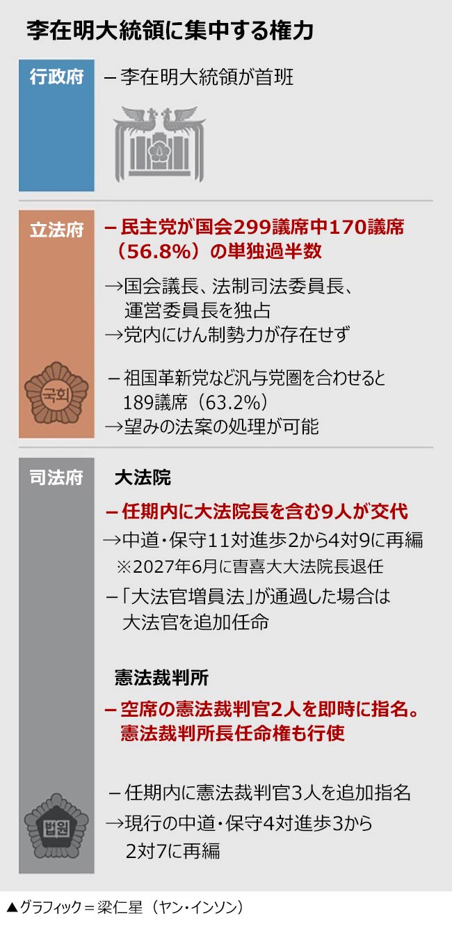 尹錫悦政権は、このような民主党の立法強行に大統領の拒否権で対抗したが、李在明政権では党と政権の意見が一致しているので、国会を通過した法案はそのまま施行される見込みだ。民主党は既に、李大統領の公式就任翌日の6月5日から国会を開きたいとして、「6月臨時国会召集要求書」を国会に提出した。大統領に当選したら刑事裁判を停止するという内容の刑事訴訟法改正案、李大統領の公職選挙法違反事件の裁判で免訴判決を可能にする選挙法改正案などの処理に乗り出すだろうという見方がある。李大統領の司法リスクを法改正で除去するというわけだ。