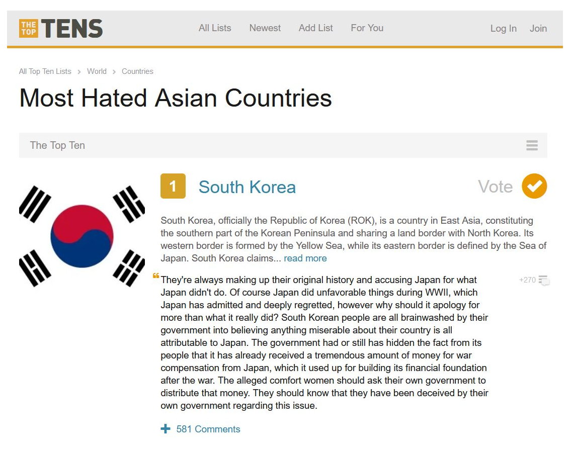 君たち韓国人に必要なものは捏造されていない歴史の勉強と、世界で自分達がどのように見られているかを知る客観性だよ。