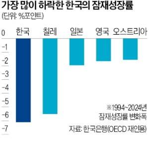 潜在成長率は、労働、資本および生産性を活用して物価を刺激せずに達成できる最大成長率で、国家の基礎体力を示す経済指標だ。経済規模が大きくなるほど低くなるのが一般的だが、韓国は下落幅と速度が有毒に目立った。 1人当たりの国内総生産(GDP)が4万ドルから5万ドルに増加した時期の潜在成長率変動幅を見ても、韓国は約1.4ポイント離れて最も多く下落した国と分析された。米国とオランダ、カナダはこの時期に潜在成長率が上昇した。