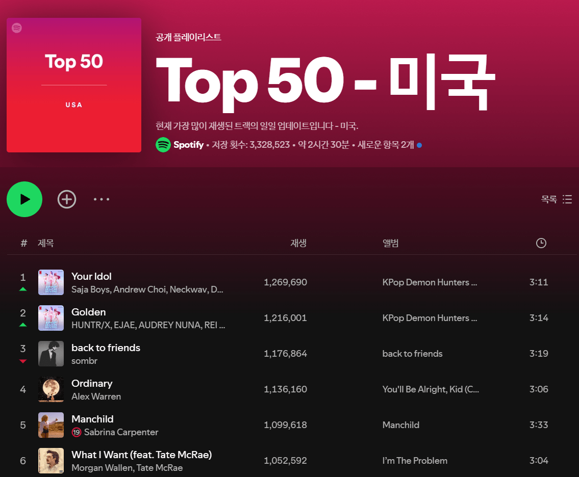 7일(국내시간) K팝데몬헌터스의 수록곡 '유어 아이돌'과 '골든'은 이날 오후 2시 기준 스포티파이 미국 탑 50 차트에서 각각 1, 2위를 달성했다.