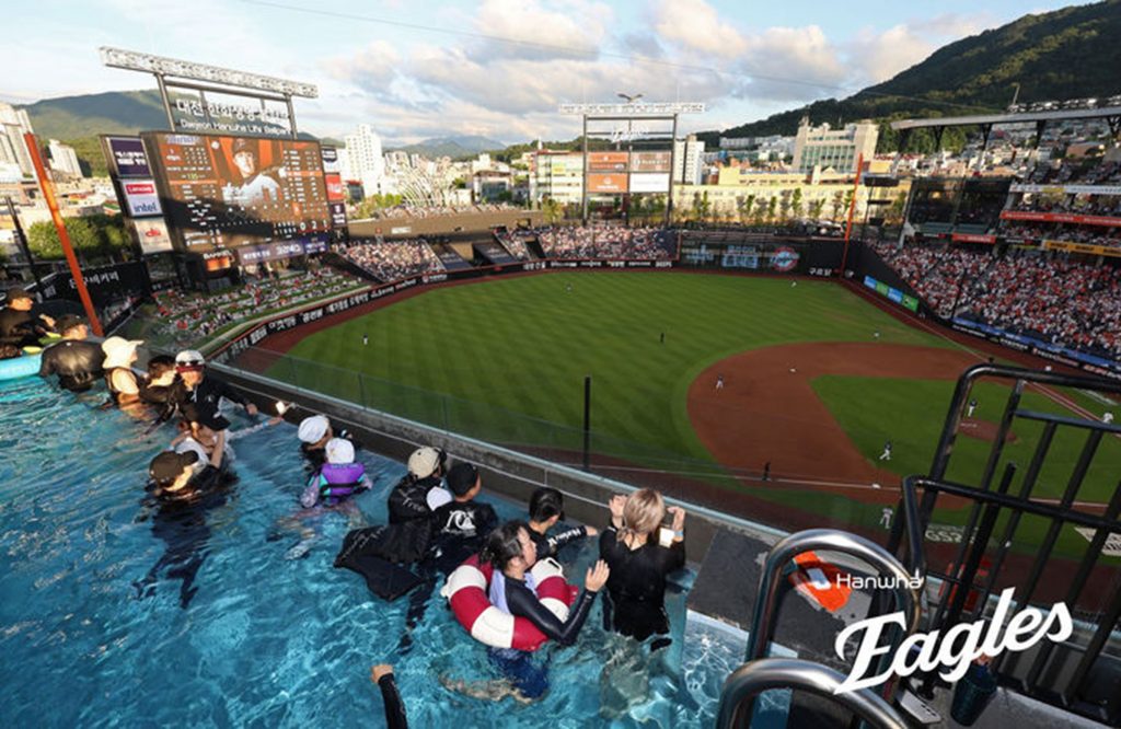 ハンファは7月1日、同球場で開催されたKBOリーグのNCダイノスとのホーム戦からこのプールの試験運営を開始した。プールは球場3塁側の4階に設置されており、マンションの8階に相当する高さに、横15メートル、縦3メートル、深さ1.5メートルの大きさを持つ。