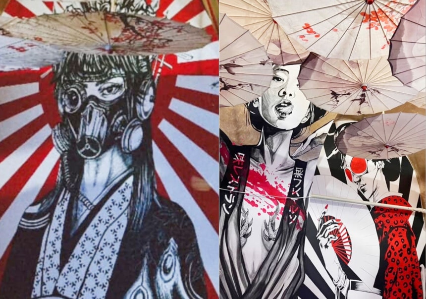 ルーマニア在住韓国人からの情報提供によると、この店の名前は「Bite me Korea」で、韓国式ホットドッグを主力メニューとして販売する。しかし内部は典型的な日本風インテリアで作られ、旭日旗模様まで掲げられており現地の韓国人社会が反発している。