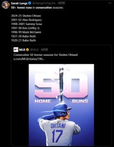 最近のDodgersのxでは、自信を喪失したタナスコを使い続けるロバーツに対する批判のほうが多いが(特に山本登板時)50号!