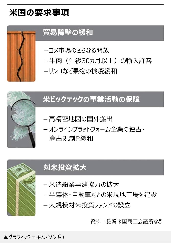 米国のドナルド・トランプ大統領が今月7日、日本・韓国などに対して「来月1日から25%の相互関税をかける」という最後通告を行って交渉を押し付ける中、大統領が国内向けに掲げることのできる確実な成果物を韓国政府に新たに要求してきたものと解されている。